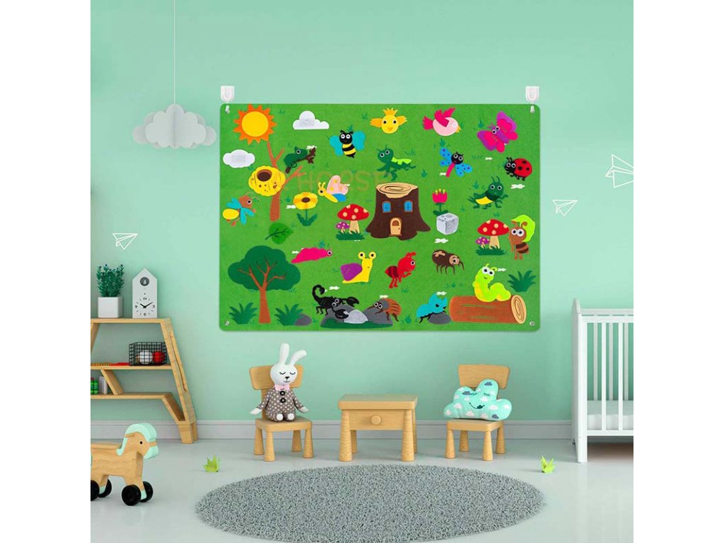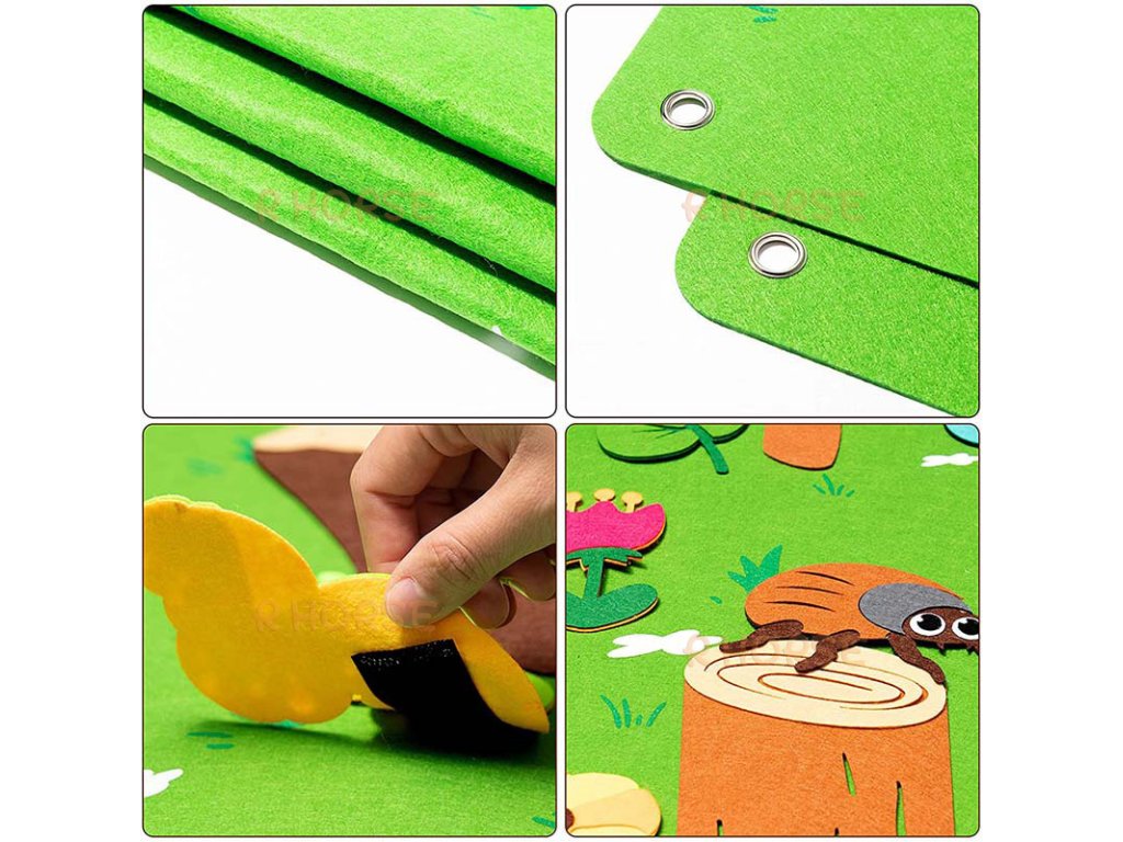 Obrázky jsou vyrobené z filcu/plsti. Velikosti obrázků jsou vhodné pro malé ručičky. Tyto interaktivní plstěné obrázky lze opakovaně přesouvat na plstěné desce. S připojenými 4 robustními háčky lze velkou plstěnou podkladovou desku snadno zavěsit.